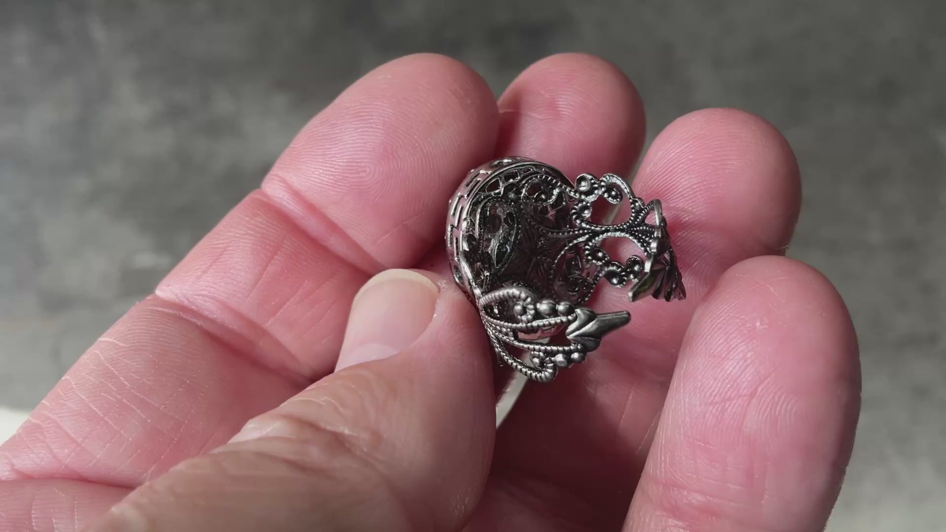 There are 6 pieces in total, 2 left just as set Cabochons and the other 4 attached to simple adjustable rings with a style complementary to the antique style Cabochon setting. The metal frame that the Cabochons are set into have a hole on each point of the compass to give you options to create an individual piece as a broach, pendant or ring.